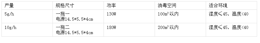 | 10g/h | 一拖二 電源14.5*5.5*4cm | 180W | 200m3以?xún)?nèi) | 濕度≤45,溫度<40 |